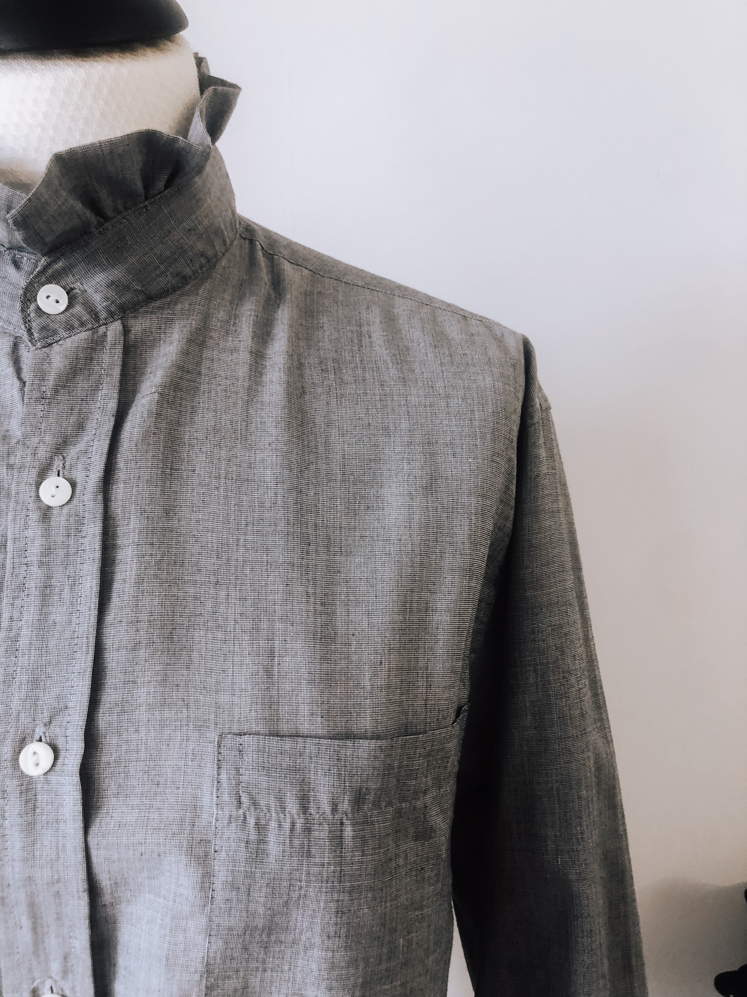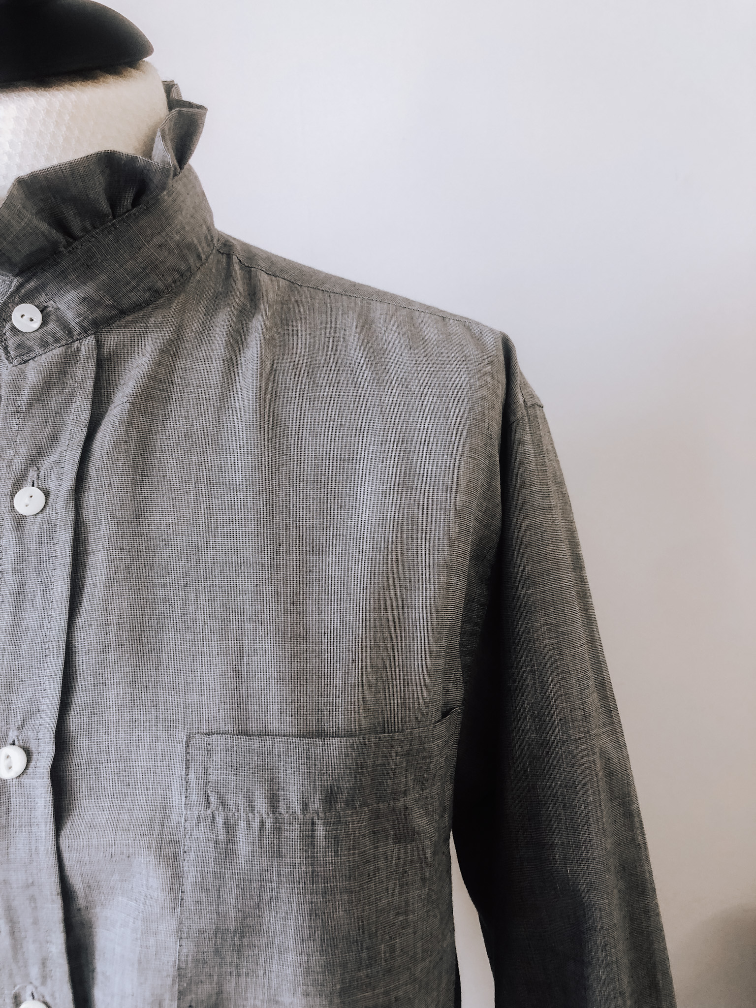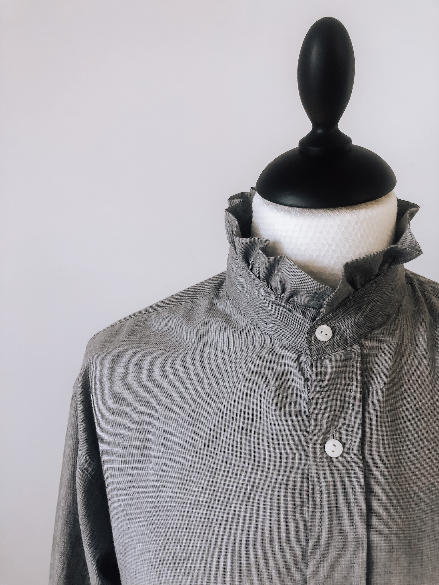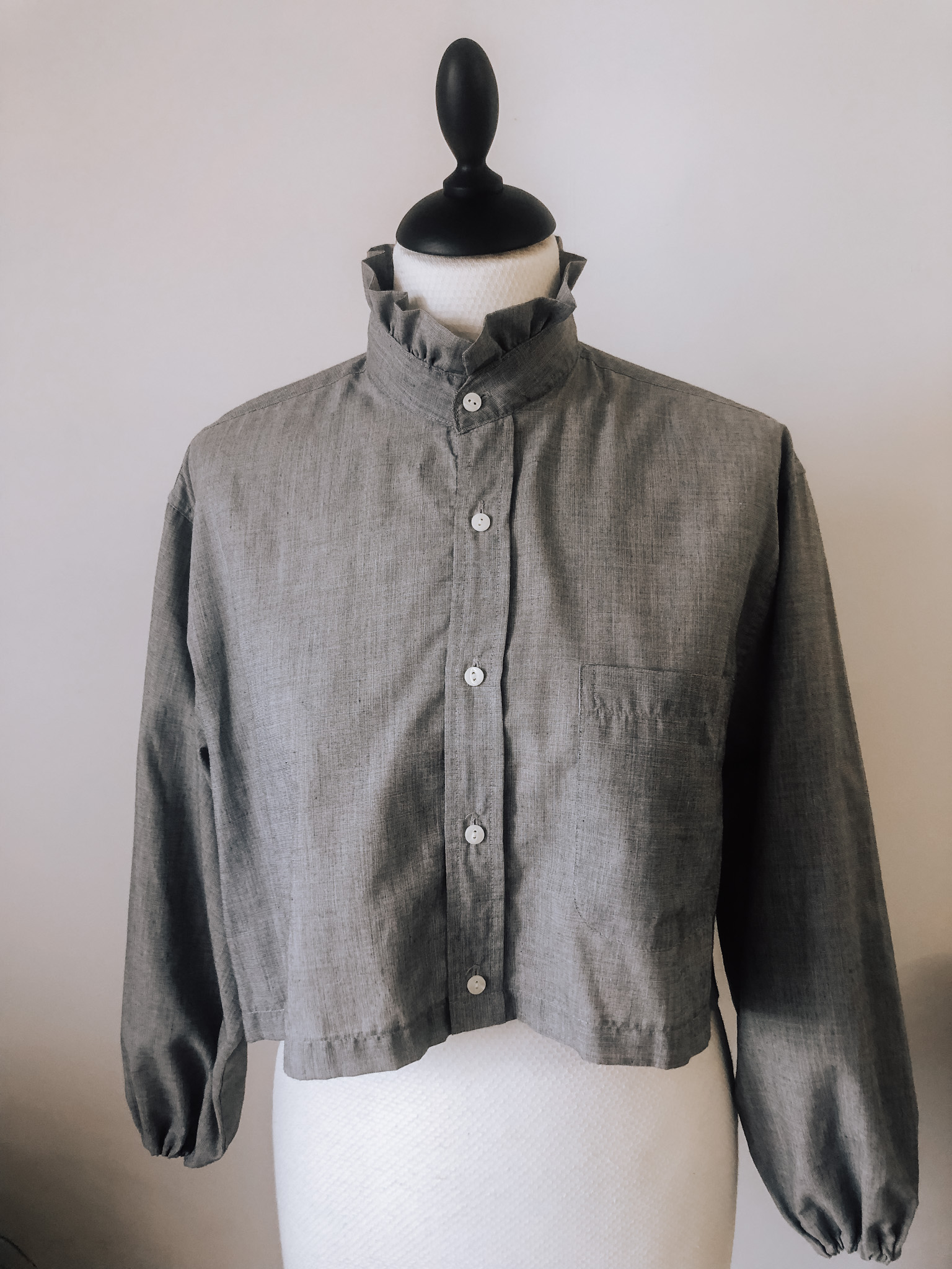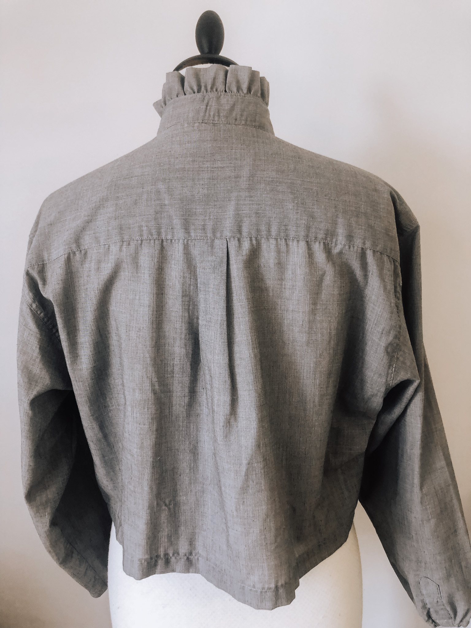 Opale est une chemise grise et courte au style romantique. Son col est froncé et ses manches bouffantes resserrées par un élastique dans le bas. La coupe de cette chemise est évasée. Elle s’ouvre et se ferme à l’aide de petit boutons de couleur crème.