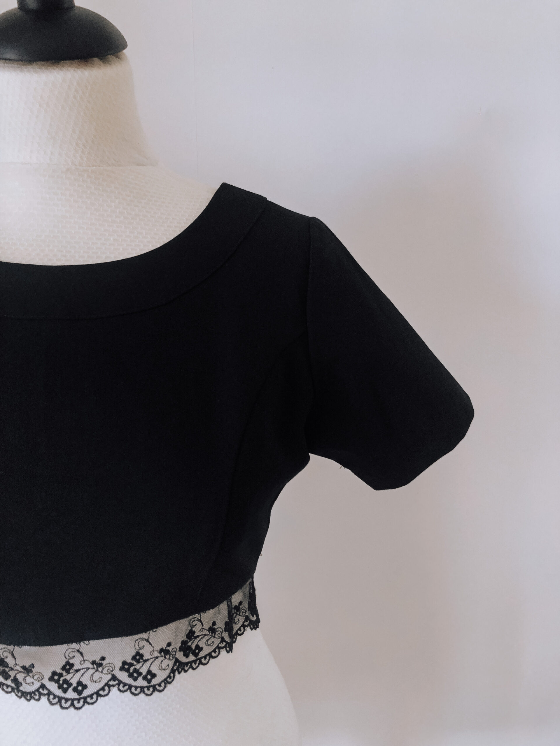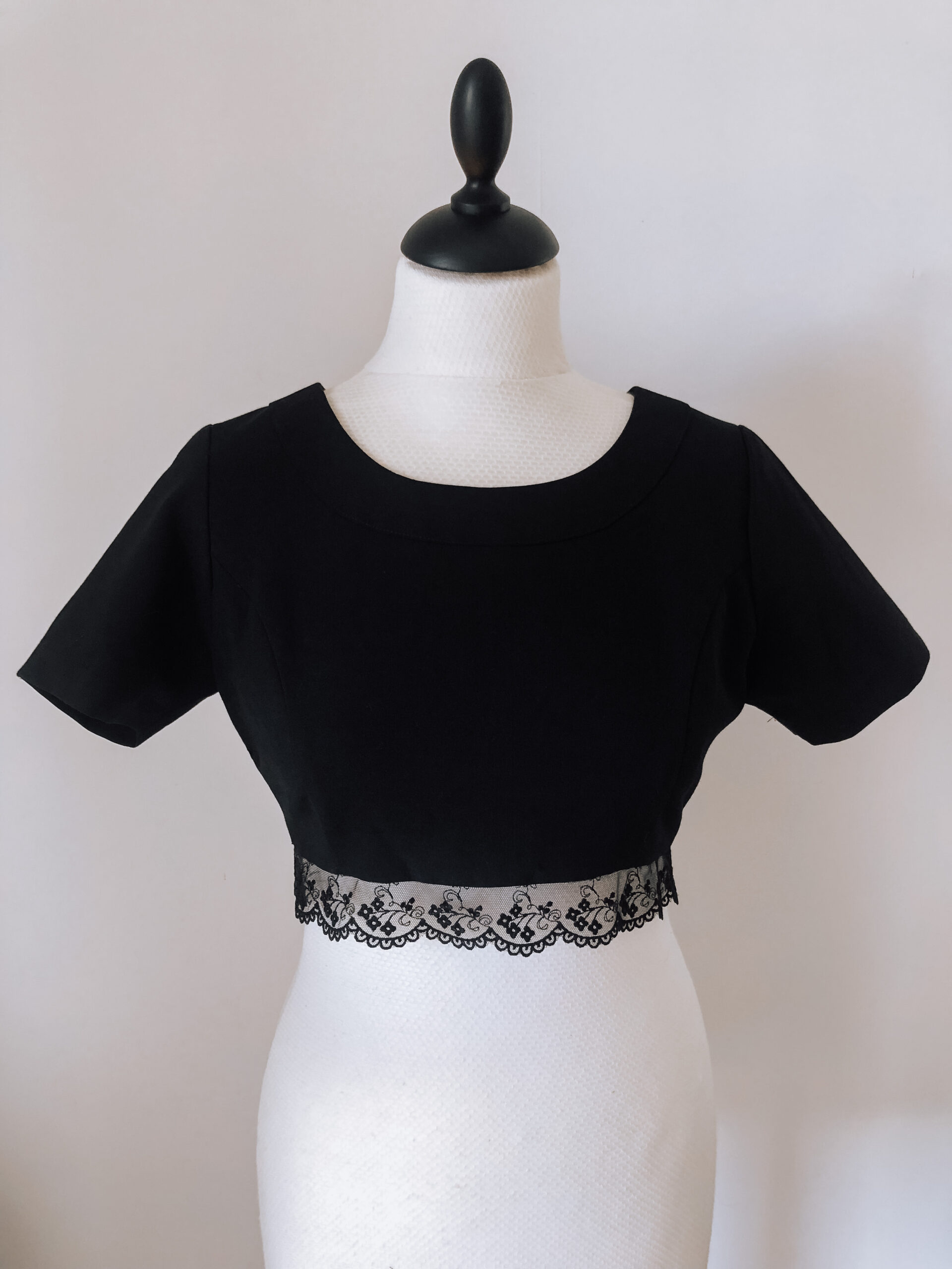 Béryl est un Crop-Top noir avec une petite finition en dentelle à motif fleuris dans le bas qui lui donne un stye boheme chic. Ça coupe est structurée et cintrée.Il se ferme par le dos à l’aide d’une fermeture à glissière séparable. L’intérieur est doublé avec un satin noir pour plus de confort.